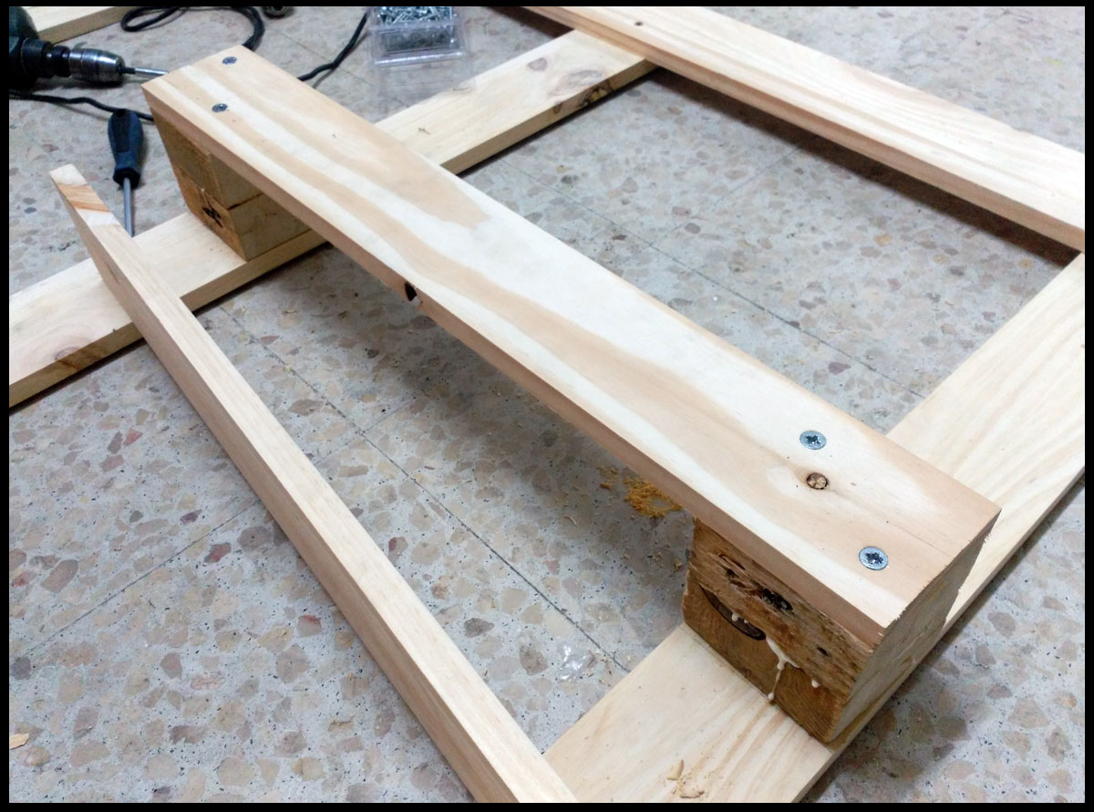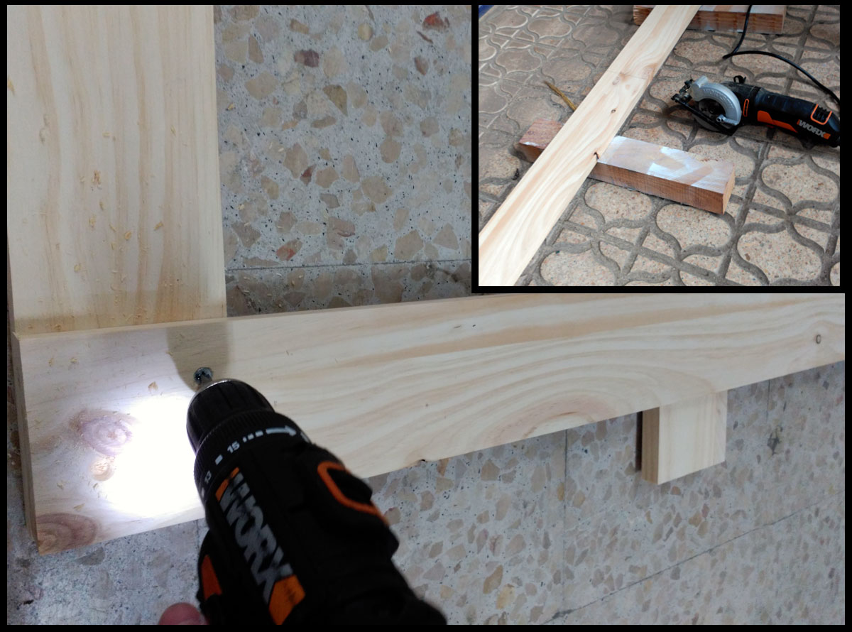 Una vez tenemos todas nuestras maderas listas y perfectamente preparadas pasamos a unir todas las piezas. Para ello presentamos las maderas verticales, dejando una separación entre las más exteriores de justo el ancho que tienen las maderas horizontales. Para unirlas, damos cola entre ambas caras y con unos tornillos las dejamos perfectamente unidas. Se puede hacer un taladro previo con una broca